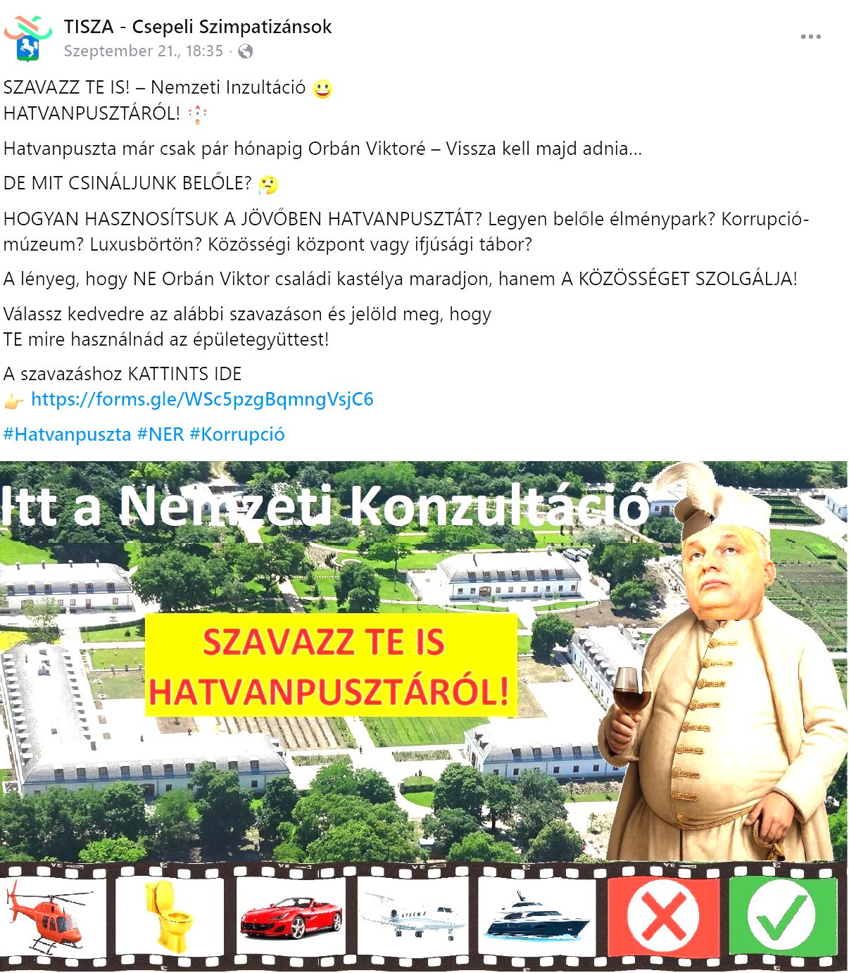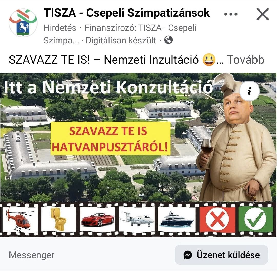 A napokban jelentek meg Csepel környékén azok a Facebook-hirdetések, melyekben a “Tisza – Csepeli Szimpatizánsok” csoport Orbán Viktor és családja vélt vagy valós vagyonáról szavaztatja olvasóit. Konkrétan arról, hogy elkobzásakor mire hasznosítsák. Azt sem rejtik véka alá, hogy lélekben már megnyerték a választást, így már csak el kell jutni a jeles napig, hogy a vagyonelkobzások megkezdődjenek: