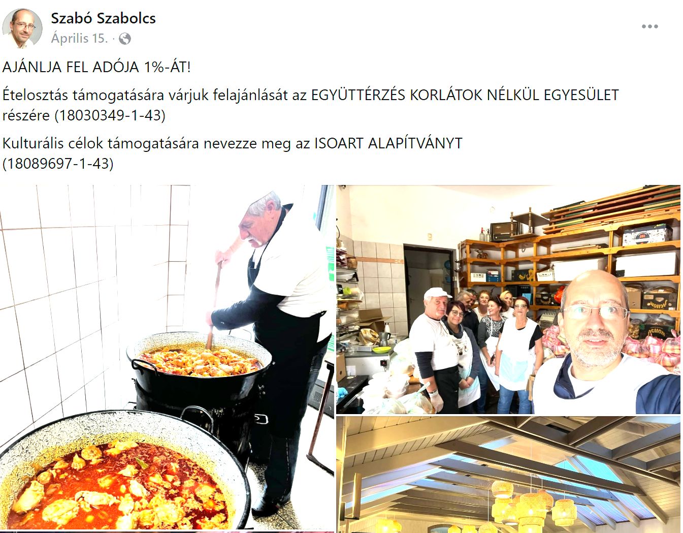 Szabó Szabolcs saját civil szervezetével tart rendszeresen ételosztást. Ezzel szerinte semmi baj nincs, mivel civilként jótékonykodik. Saját esetében az sem zavarja, sőt örül annak, ha gyerekekkel fotózzák – hiszen minden szentnek maga felé hajlik a keze. Többször is ingerülten utasította vissza, ha bárki bármilyen politikai szándékot látott a jótékonykodása mögött. Elvégre a civil pénzből oszt ételt. Azt viszont nem hagyja szó nélkül, ha mások, például az önkormányzat is ezt teszi. Mert a mögött ismét csak politikai szándék állhat.